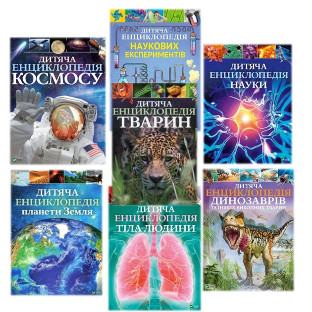 1. Дитяча енциклопедія тіла людини. Клер ГіббертЦя корисна енциклопедія стане у пригоді допитливим дітлахам, адже відкриє найцікавіші таємниці людського тіла — від найдрібніших елементів клітини до тканин і систем органів. Діти дізнаються безліч захопливих наукових фактів про те, як працює мозок, що таке гени і ДНК, з чого складається людське тіло й чому так злагоджено працює. Ця книжка — справжній гід з анатомії та фізіології, отже, допоможе розширити кругозір маленьких розумників й урізноманітнити знання, здобуті на шкільних уроках.2. Дитяча енциклопедія динозаврів та інших викопних тварин.Клер ГіббертДитяча енциклопедія динозаврів — унікальний шанс вирушити в подорож доісторичною Землею і познайомитись із найзагадковішими істотами на планеті. Достовірні факти, яскраві реалістичні ілюстрації та захопливі подробиці зроблять занурення у світ стародавніх ящерів незабутнім.3. Дитяча енциклопедія наукових експериментів. Канаван ТомасМрієш стати науковцем та здійснювати неймовірні та важливі наукові відкриття? Ця дивовижна книга познайомить тебе з основними законами хімії, біології та фізики, які ти зможеш перевірити на практиці. Які найзахопливіші досліди та експерименти? Звісно ж, ті, які можна провести вдома! Тобі допоможуть докладні інструкції, а також малюнки та фотографії. Нумо, беремось до справи, любий розумнику!4. Дитяча енциклопедія тварин. Ліч Майкл, Лленд Меріел«Дитяча энциклопедія тварин» — унікальний шанс познайомитися з найзагадковішими мешканцями нашої планети. Юні читачі дізнаються багато нового про ссавців, земноводних, рептилій, птахів, риб і комах.Достовірні факти, яскраві реалістичні ілюстрації та захопливі подробиці зроблять занурення у світ тварин незабутнім.5. Дитяча енциклопедія планети Земля. Хібберт Клер, Гонор ГедВідкрий для себе наш неймовірний світ і все, що його сформувало, — від вулканів і землетрусів до вітріві дощу, а також діяльності людини. Наповнена несподіваними фактами і приголомшливими фотографіями, ця книга досліджує континенти, їх клімат і людей, що живуть там. Вона стане справжнім гідом по планеті Земля і проведе нас від часів зародження Сонячної системи до наших днів.6. Дитяча енциклопедія космосу. Сперроу ДжайлсЦя енциклопедія — унікальний шанс вирушити в подорож у найвіддаленіші куточки Всесвіту, розкрити таємниці темної матерії, довідатись якомога більше про інші світи, краще пізнати нашу ніби знайому, але таку загадкову Землю.Достовірні наукові факти, яскраві реалістичні ілюстрації та світлини, захопливі подробиці зроблять мандрівку міжзоряним простором незабутньою. 7. Дитяча енциклопедія науки.Сперроу ДжайлсЦя корисна енциклопедія стане у пригоді допитливим дітлахам, адже відкриє найцікавіші таємниці майже всіх галузей науки. Читачі дізнаються, з чого складається атом, коли народився Всесвіт, завдяки чому «працюють» розумні матеріали, як улаштований організм людини та безліч дивовиж, що нас оточують. Із цією книжкою навчання перетвориться на справжнє задоволення, під час якого діти не лише ознайомляться з найважливішими досягненнями науки, а й поступово розвиватимуть увагу, пам’ять і критичне мислення.