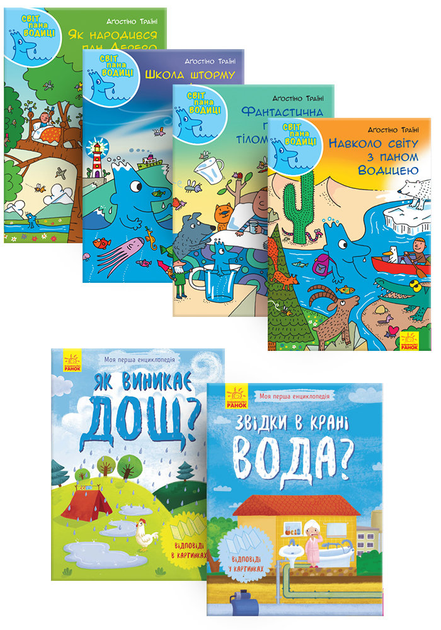 У комплекті: Навколо світу з паном Водіцею Фантастична подорож тілом людини Школа шторму від пана Водиці Як народився пан Дерево Книжки серії “Світ пана Водиці” відомого на весь світ автора та ілюстратора Аґостіно Траїні знайомити малечу з основними поняттями про нашу планету: як виростає дерево, як утворюється шторм, куди дівається вода. А кумедний та простий виклад інформації допоможе дітям зрозуміти, які процеси відбуваються у тілі людини та у довкіллі. Звідки в крані вода? Моя перша енциклопедія Як виникає дощ? Моя перша енциклопедія «Моя перша енциклопедія» – це серія пізнавальних книжок для малюків. Книжки-розкладачки наочно і в доступній формі показують юним дослідникам, як виникає дощ, як виростає дерево, як утворюється мед тощо.