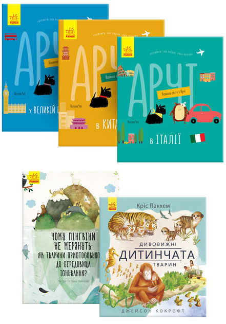 У комплекті: Арчі в Китаї Арчі в Італії Арчі у Великобританії Ця яскрава серія – справжнє відкриття! Малята будуть відкривати для себе Великобританію, Італію, Китай у веселій компанії кумедного пса Арчі. У легкій ігровій формі маленькі читачі зможуть дізнатися багато нового. Дивовижні дитинчата тварин Щодня в світі народжуються мільярди істот. Від маленьких жабок та хробачків до великих тигрів та ведмедів. Відкрийте для себе історії їхнього життя від самого народження. Кріс Пакхем заснував серію передач для дітей The Really Wild Show (“Справжнє дике шоу”) на телеканалі BBC, а незабаром створивши власну телевізійну компанію та запустивши серію передач про дику природу для BBC та National Geographic. Чому пінгвіни не мерзнути: як тварини пристосовуються до довкілля Чому тварини пустелі мають великі вуха і світлий колір& # 063; Пінгвіни мешкають серед льоду та снігу, чому вони не мерзнуть. Можуть тварини жити у скелястих горах. Авжеж так! Природа попіклувалася, щоб шкірна істота могла пристосуватися до свого середовища. Гайда у подорож світом по глибинах океанів, барвистих джунглях та величних гірських вершинах. Зустрінемо найдивовижніших тварин і рослин та дізнаємося, як вони пристосовуються до різних природних умів.