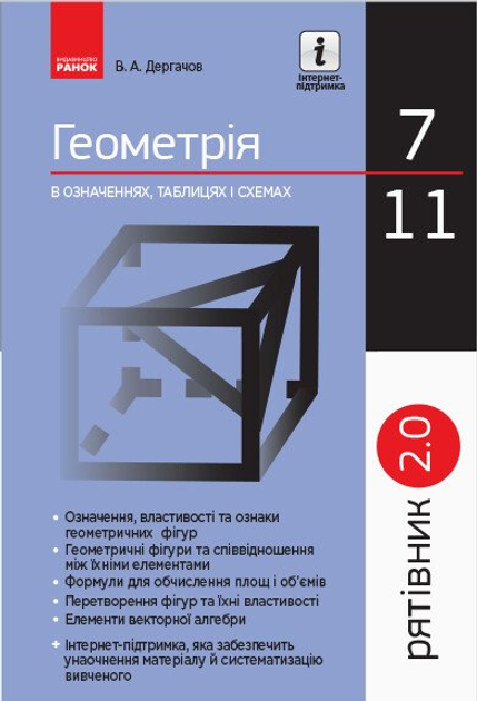 Посібник містить основні положення шкільного курсу геометрії. Наочна форма викладення матеріалу у вигляді таблиць допоможе узагальнити та систематизувати знання з геометрії, дозволить скоротити час на повторення вивченого напередодні контрольної роботи, державної підсумкової атестації, зовнішнього незалежного оцінювання, а також удосконалити навички самостійної роботи з довідковою літературою. Призначено для учнів 7–11 класів закладів загальної середньої освіти та абітурієнтів.